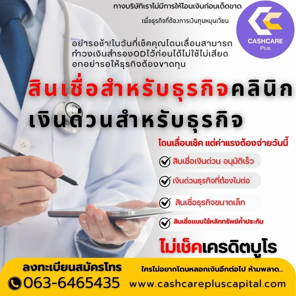 สินเชื่อสำหรับธุรกิจคลินิก ทางออกของเงินด่วน การบริหารคลินิกในยุคปัจจุบัน ไม่ว่าจะเป็นคลินิกความงาม คลินิกทันตกรรม คลินิกแพทย์ หรือคลินิกเฉพาะทาง ล้วนต้องใช้เงินทุนหมุนเวียนอยู่ตลอดเวลา ทั้งค่าแพทย์ ค่าพนักงาน ค่าอุปกรณ์ทางการแพทย์ ค่าเวชภัณฑ์ รวมถึงค่าเช่าสถานที่